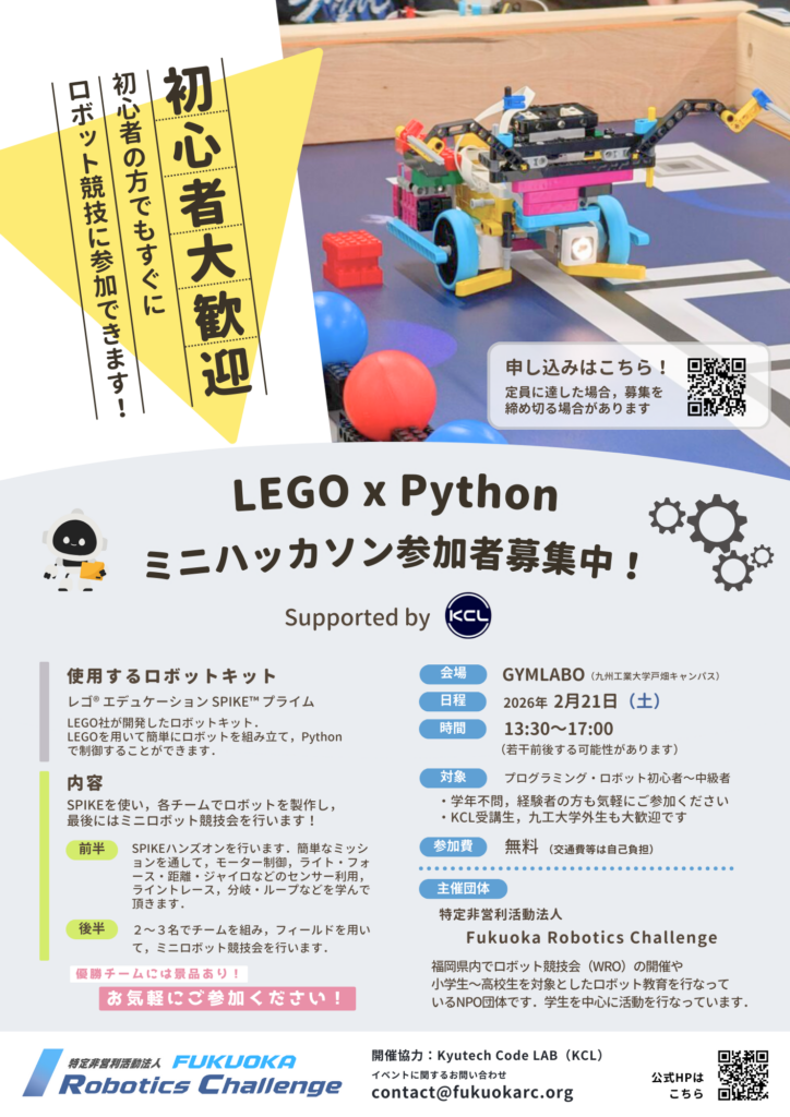 2026年2月21日(土)に九州工業大学GYMLABOにて大学生向けイベントを行います.ロボット・プログラミング初心者〜中級者向けのイベントです.九州工業大学の学生以外の方でもご参加可能ですので,ぜひご参加ください!